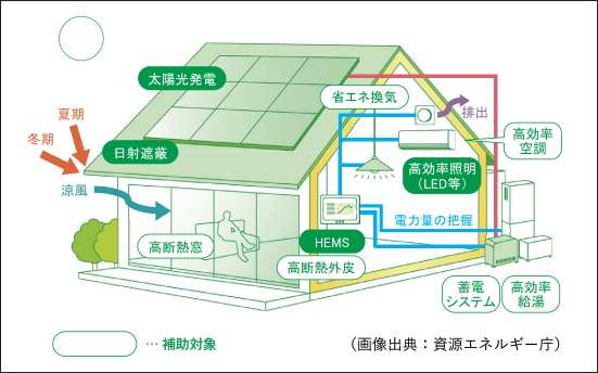 ZEH(ネット・ゼロ・エネルギー・ハウス)とは住宅の躯体・設備の省エネ性能を向上、さらに効率的な住宅設備や再生可能エネルギー(太陽光発電等)をプラスすることで、一般住宅で年間消費するエネルギーの収支がほぼゼロになる住宅のことです。