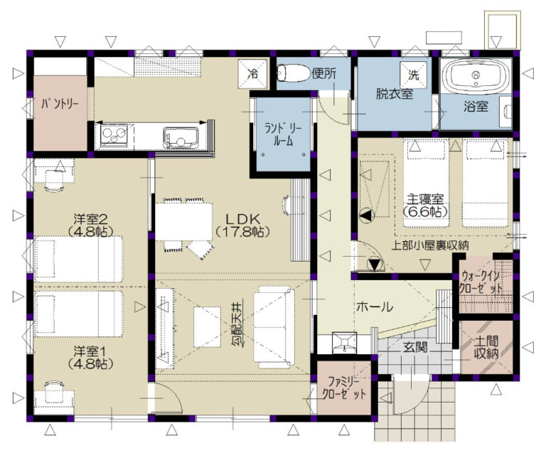【その2】家族や将来の変化に対応できる柔軟性: 平屋は間仕切り壁を柱や梁で支えるため、内部の壁配置を自由に変更することができます。これにより、家族構成やライフスタイルの変化に合わせて間取りを柔軟に変更することができます。