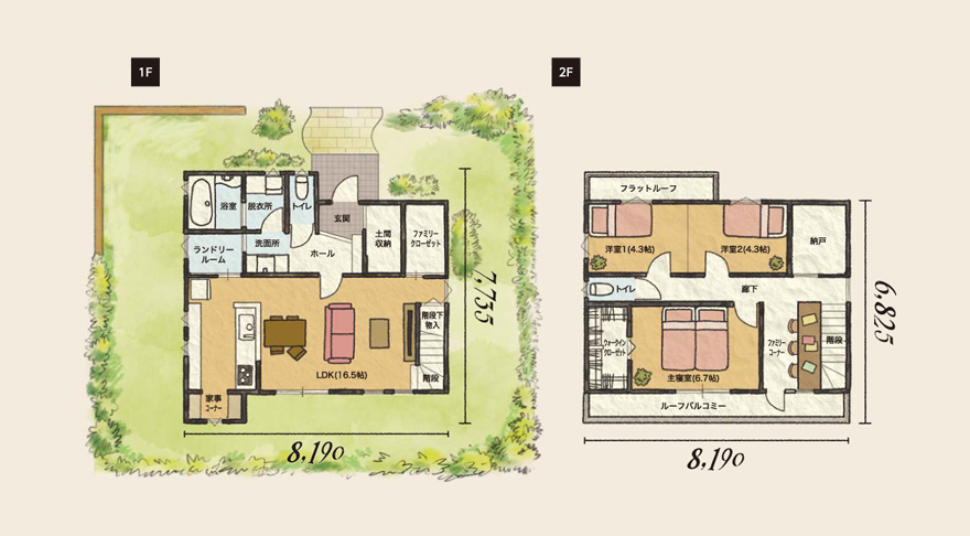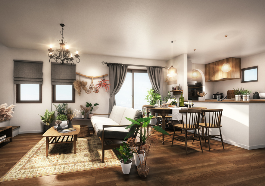 家事動線を意識した使いやすい間取りと、豊富な収納スペースが魅力の「家事収納の家」。毎日が心地よくなるような、やさしくナチュラルなデザインで男性女性共に大人気です。