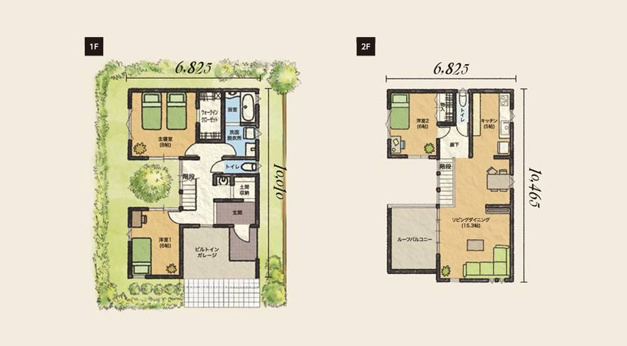 中庭、ルーフバルコニー、勾配天井、高窓が光を取り込み、2階のLDKに明るさと開放感をもたらします。中庭を中心に建物をコの字型に配置しているため、 LDKをはじめ、1階2階の各居室から中庭を眺めることができます。