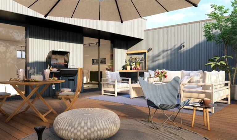 窓を隔てて繋がるリビング&テラスは、視覚的な外との境界を無くしリビングスペースに開放感をもたらします。